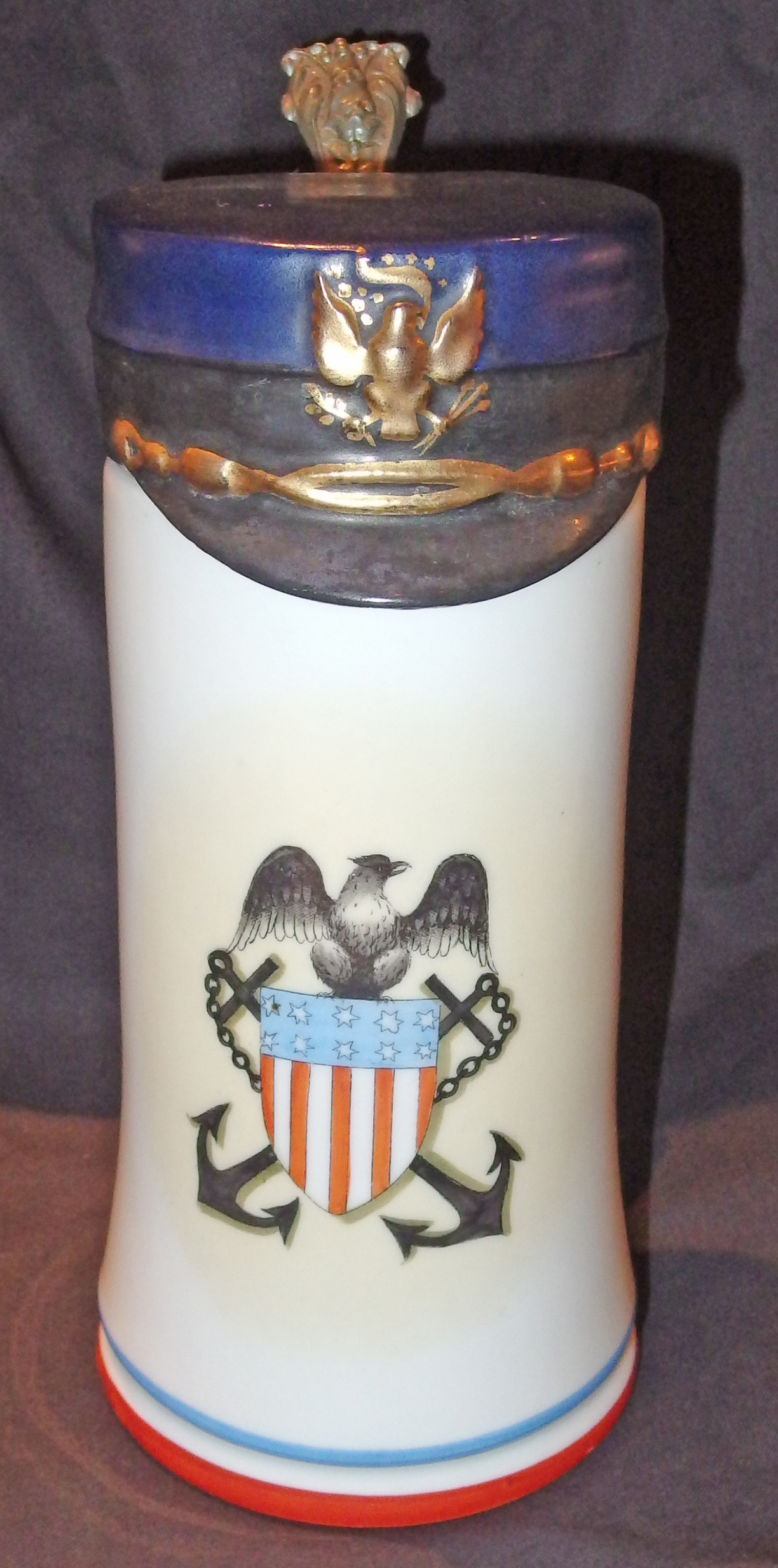 We don’t know quite as much about the second lithophane in the collection which is actually disguised as a beer stein. Made for the American market, it features a naval looking cap (as the lid) with an insignia that is an adaptation of the Great Seal of the United States. The body of the stein also features an insignia used by the US Navy starting about 1870. We know it was produced in Germany because of an impressed number in the bottom, a practice characteristic of the German manufactories; the tell-tale thumb hold on the lid; and the lithophane itself which depicts an obviously German scene.