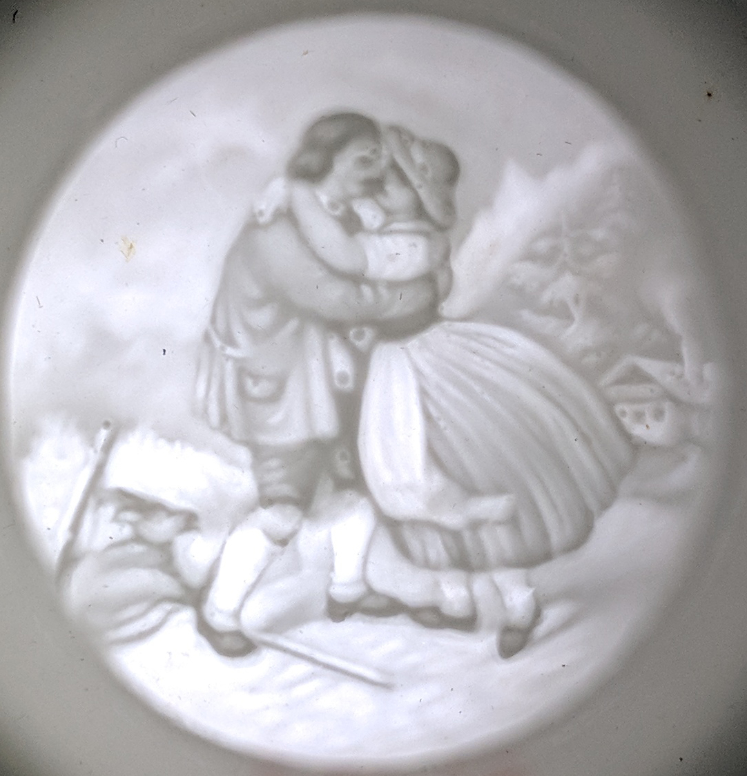 Subjects impressed in the surface range from reproductions of old master paintings, to landscapes and seascapes, representations of historical stories and portraiture (i.e. people talking, dancing…or, um…doing other things…keep reading). As you would expect, the truly fantastic lithophane in our collection shows a massive 17thor 18thcentury naval battle. Unfortunately the battle hasn’t been identified, but it involves a huge number of British and possibly Dutch vessels. If I had to take a guess, I think it might be a scene from one of the Anglo-Dutch wars.