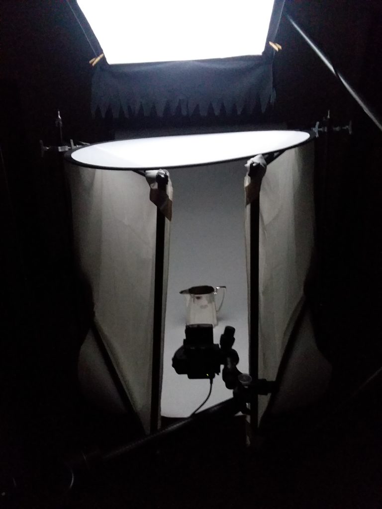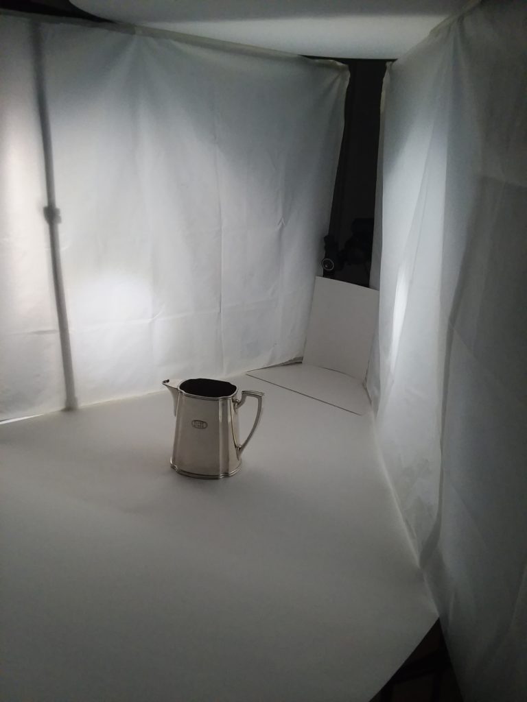 最简单的方法来拍摄高反射的东西,然后,是给它一些除了周围的房间(和摄影师)反射回镜头的东西。就银而言,最好是白色的东西。白色会让银色看起来更像真正的银色。