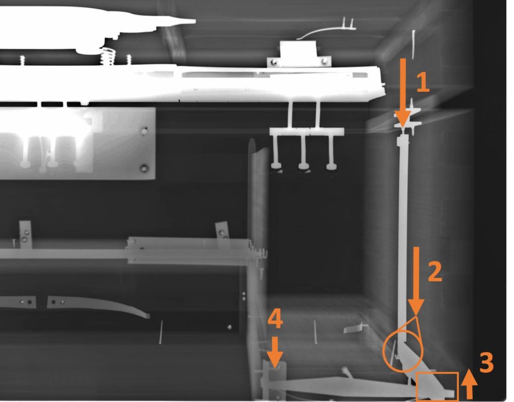 除了对之前发现的许多不同的隐藏机制进行成像外,我们还能够清楚地看到打开隔间的柱子和杠杆的巧妙系统!这一机制是通过按压盒子左侧的板孔来启动的(见下图)。