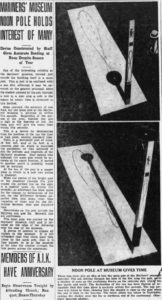博物馆的正午杆由威廉·盖特伍德设计,由一块南北走向的混凝土板组成,宽约5英尺,长约20英尺。根据博物馆的纬度和太阳的偏斜调整后的8字曲线嵌入混凝土表面。南端立着一根十英尺高的杆子,顶端是一块铜板,上面有一个两英寸的洞。这座柱子由Sumner Besse建造,上面装饰着“木雕和彩色油漆”。根据当时的一份报纸报道,这些雕刻包括埃及太阳神拉和向日葵。