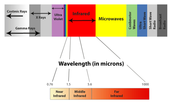 红外线辐射(有时称为红外光)是电磁波谱中的能量。可见光,或我们眼睛能看到的光,能量范围在380-740纳米之间。红外线(IR)的能量范围约为700纳米- 1毫米,比我们肉眼所能看到的范围要宽得多。