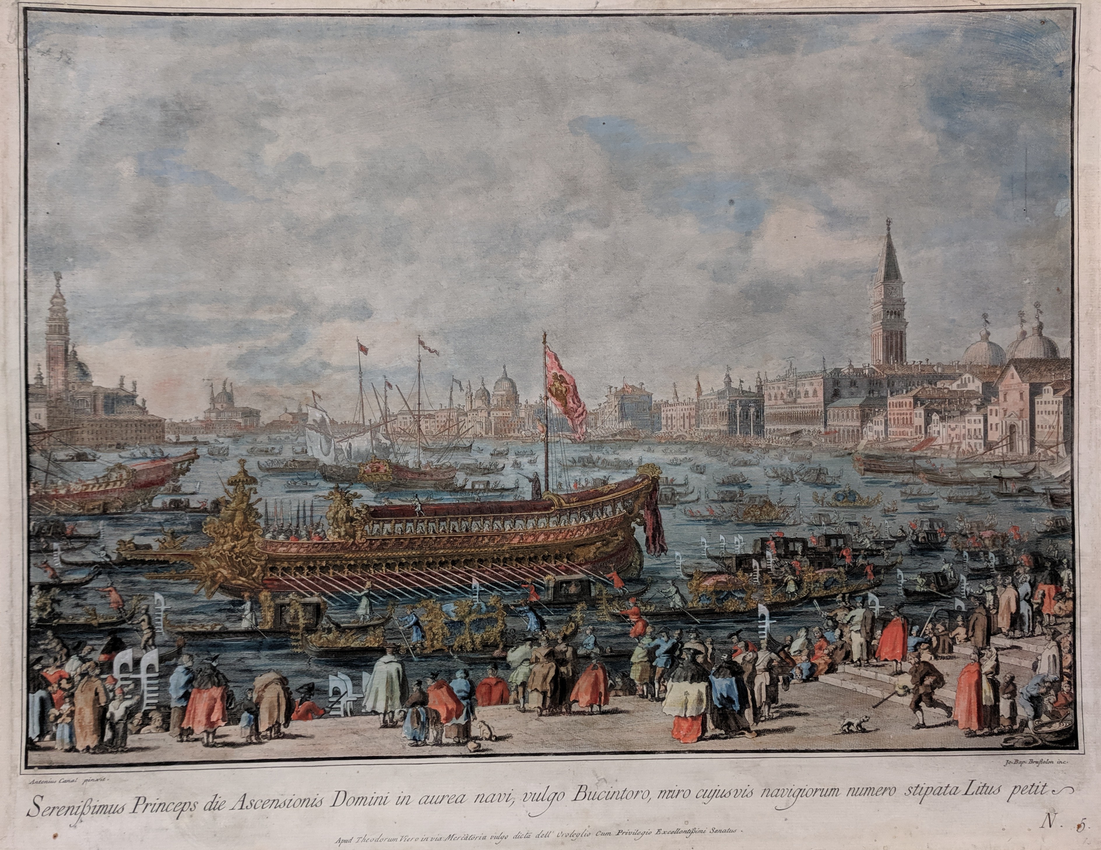 Beginning in 1311 the doge’smaestà nave, which was probably just a small galley in the Venetian fleet, was replaced with a large state barge called a Bucentaur. Over the centuries just three more Bucentaur were built—a replacement for the 1311 vessel in 1526, another in 1606, and the last and reputedly the most magnificent of them all in 1727 (the vessel illustrated in the prints that accompany this post).