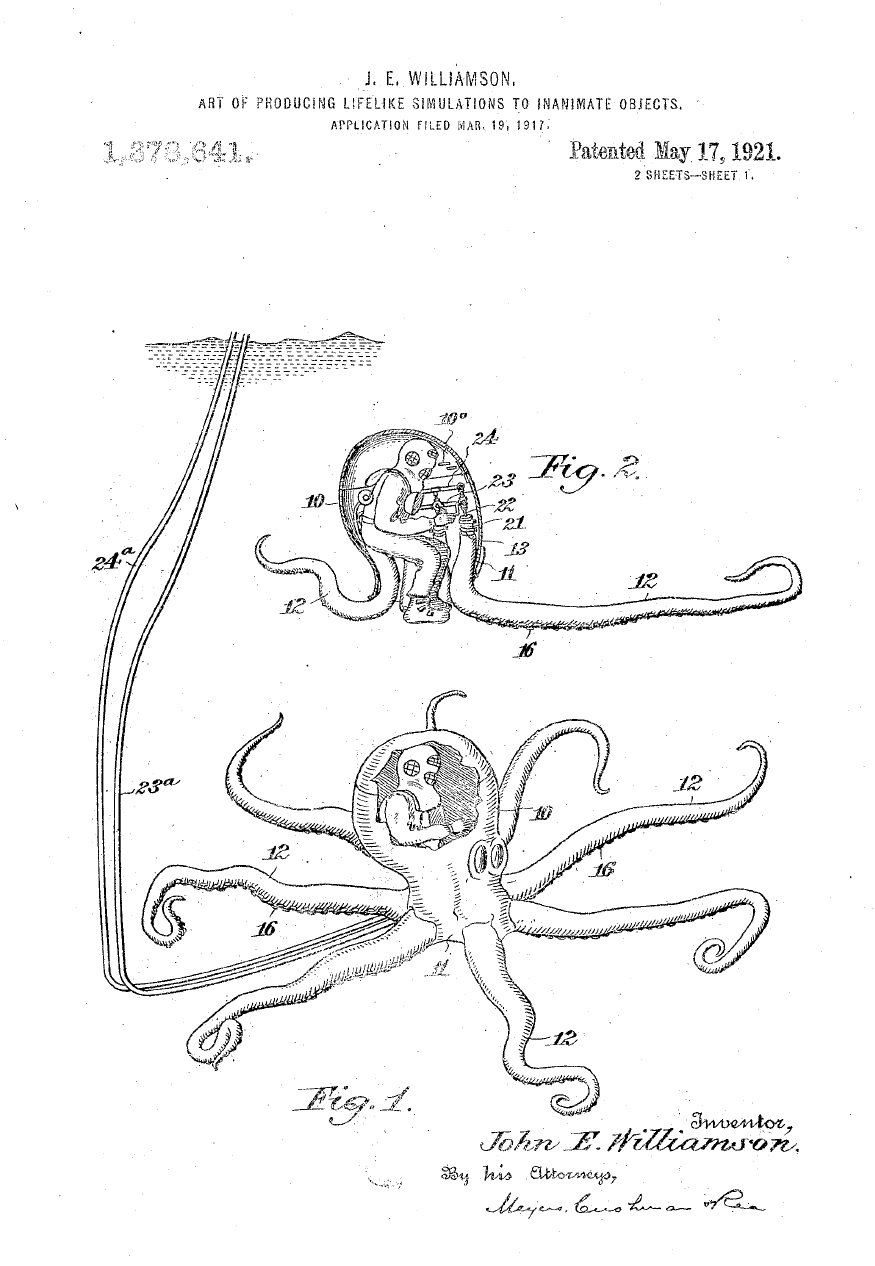 Ever the showman, Williamson wanted to include the scene of Captain Nemo’s battle with a giant octopus. Since there was no way he was going to find a live creature large enough and cooperative enough to act as he wished he decided to build one. To make the tentacles writhe, squirm, reach out and grab objects, draw them in and then coil around them, Williamson used a rubber tube surrounded by tapered springs that could be inflated with compressed air to simulate the arm reaching out. As the tube deflated, the springs would drawn the arm back in. The structure was covered with a material that represented the octopus’s skin and rubber balls of graduated sizes were cut in half to represent the sucking disks. It worked so well, Williamson actually patented his idea!