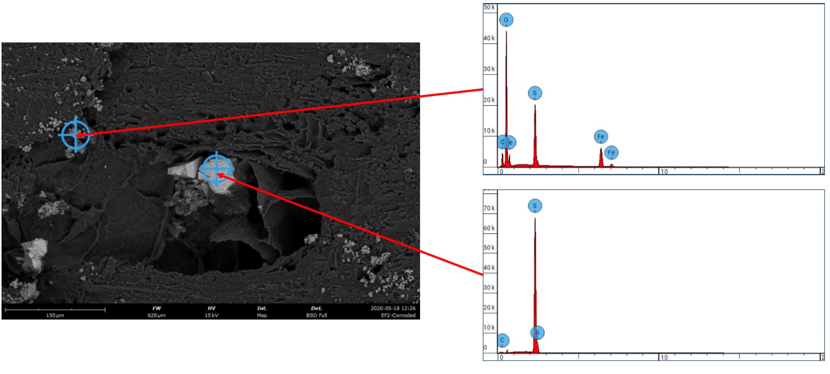 接下来,我想看看微尺度上发生的恶化。我们将几个样本提交给Nanoscience Instruments Inc.,他们在扫描电子显微镜(一个花梢设备上射击电子到样本的花式设备,同时也能够分析存在的元素)。在用这种技术看木材样本时,我们能够看到我们在木材的细胞结构中存在含有元素的硫和铁/硫化合物,图7.看起来恰好发生了如此接近的是非常令人兴奋的 -并确认木材呈现硫磺相关问题(科学真棒)!