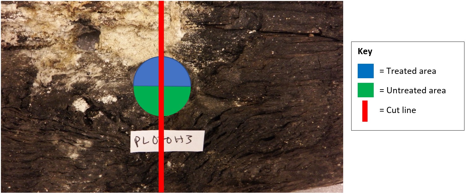 当我们返回博物馆时,我将通过用5种不同的产品处理木材上的紧固件孔来开始测试。The fastener holes were chosen for testing because they can be easily cut to assess how well each treatment works and tend to be the most acidified areas of the timbers, Figure 10. After the timbers are treated, I’ll cut each fastener hole and measure the pH at several depths over a period of months to assess how well each treatment works both in the short and long term. This information will serve as the basis for my fellowship as we continue building our plan for the larger treatment of the collection.