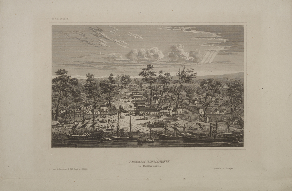 有一张图片引起了我的注意,是加州萨克拉门托的,因为在底部的角落里有一艘蒸汽船,桅杆之间挂着一面横幅,上面写着一个名字:参议员.哦,值得研究的有趣的东西!印刷出现在几个版本的书,特别是在迈耶的优兴15卷109页从1852年开始美国画报在1853年出版的第二卷第150页。但我们指纹上的痕迹和这两种都不匹配,所以它至少出现在了第三个我还没找到的地方。