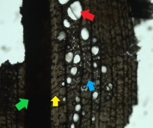 这些样本特别有趣,因为许多功能都清晰可见。例如,橡树的一个显著特征是大射线(见下面)。我可以很容易地在显微镜下辨认出这些巨大的放射状细胞。此外,我可以清楚地看到一些关键的细胞特征,如被称为“气孔”的导管元素从早木到晚木的转变,以及更小的细胞类型,如薄壁组织和管胞(更薄的细胞壁)和纤维(更厚的细胞壁)。像这样的特征有助于识别过程,因为它们在属甚至特定物种之间都不同。我必须说,调查他们让我感觉有点像一个缩小可能性的侦探!
