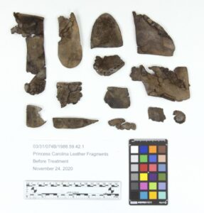 我奖学金的另一个组成部分是皮革工艺品从公主卡作为填充材料。我的工作将包括对500块皮革碎片进行记录、进行少量的保存处理(例如轻度清洁、修补等)和重新安置。这不仅是一个很好的机会来扩展我在考古收藏方面的经验,而且我还可以和我们自己的海洋考古学家合作,汉娜•弗莱明.她有一些很棒的专业知识可以分享,特别是关于收藏品的类型学,所以我们将会很兴奋地看到我们了解到什么。