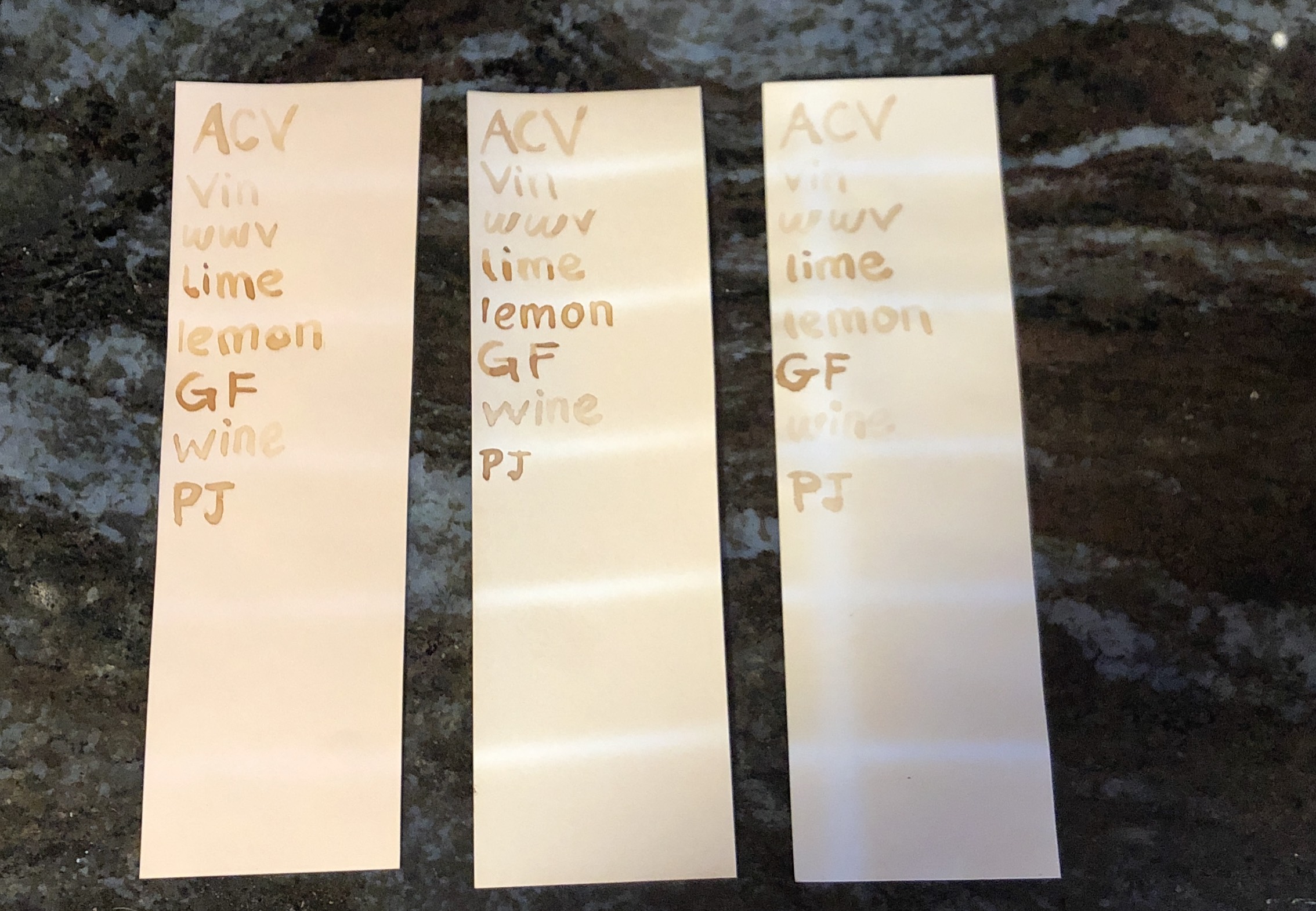 ACV – apple cider vinegar, vin – vinegar, wwv – white wine vinegar, lime – lime juice, lemon – lemon juice, GF – grapefruit juice (with sugar added), wine – white wine, PJ – dill pickle juice