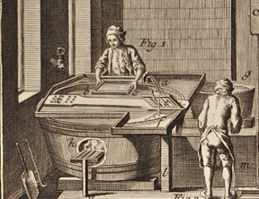 顶部:左图显示工人通过抹布进行分类以用于造纸,右图显示了制作纸,一次是从这些抹布中制成的一张纸。(Diderot Encylopedie,巴黎:1751-1765。)底部:更现代的四缸制造机的一部分图像(c。1950)。想象一下,这台机器比上面的单个纸匠可以制造的纸更多!