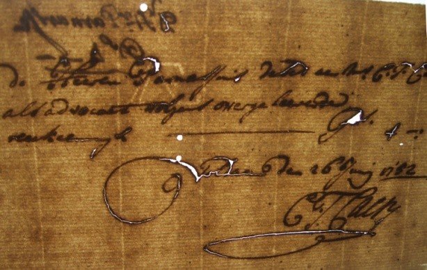 Where does acid come from in paper? It depends! It can be added to the paper from other materials that touch it, like our “ink”. For example, iron gall ink, which was widely used for centuries, can be very acidic, and in extreme cases can cause areas of the paper to fall out! (A different kind of “invisible ink?”)