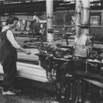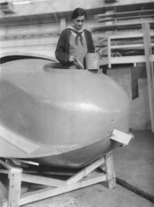 在这里,一个“女孩”正在画一艘飞行的船,柯蒂斯模型F-5-L。NAF的流水线方法大大提高了效率。
