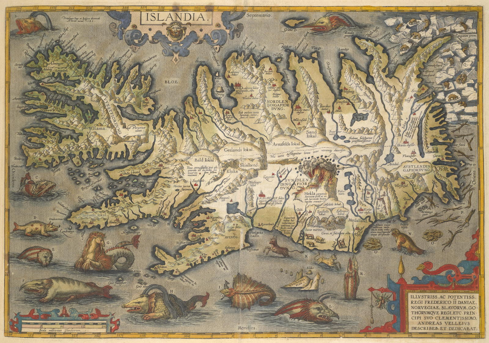 下图所示的冰岛地图首次收录在1590年版的《世界剧院》中。这张图片来自图书馆的1592版。根据冰岛国家和大学图书馆发布的一个网站,该网站展示了冰岛所有旧地图的数字化副本,“尽管这张地图在许多方面都有缺陷,但在内容和执行上都远远优于冰岛早期的所有地图。在这里,我们首次发现一张地图或多或少地全面调查了冰岛的所有定居点和大多数名胜。”[二]