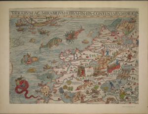如前一篇博客所述,这是16世纪最著名、最有趣的地图之一th世纪是奥拉斯·马格纳斯的时代法令滨此书于1539年首次出版。的法令滨描绘了北欧、不列颠群岛和冰岛的地理。更重要的是,这里有斯堪的纳维亚历史和民间传说中的人物,还有真实和想象中的动物。