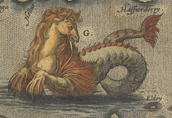 “HROSHUALUR,也就是海马,脖子上像马一样耷拉着鬃毛。它经常给渔民造成很大的伤害和惊吓。”有趣的是,地图上描绘的赫罗舒鲁尔人并不是来源于法令滨. 它起源于更古老的起源,即海马,或海马,来自希腊神话。文艺复兴时期的艺术家经常在插图中使用海马体。海马体与希腊海神波塞冬(Poseidon)有关,后来又与相应的罗马神海王星(Neptune)有关。