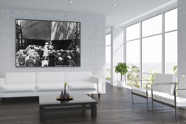 这幅版画的棕褐色调只是增添了美丽,因为这只容器似乎是一片古铜色的金属碎片。注意,在这艘船下水的远洋班轮SS美国1939年,大批宾客、权贵和群众聚集在这座巨大建筑的底部,参加它的洗礼仪式。这张引人注目的照片纪念的正是第一夫人埃莉诺·罗斯福在船首打破瓶子的那一刻。值得注意的是,这次发射发生在1939年8月31日,第二天希特勒入侵波兰,使其首次海上航行推迟了一年。