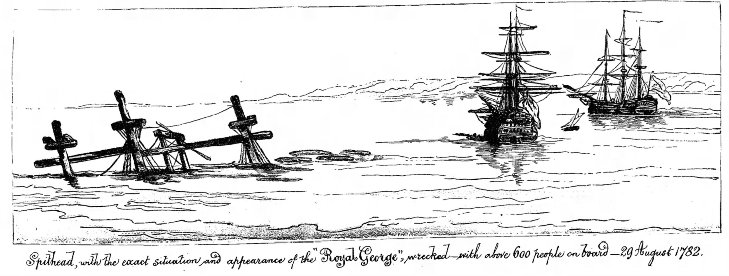这时,一切都是一片混乱。人们跑向开放的右舷港口,但随着船继续它的死亡滚动开放的港口变得无法进入。虽然大多数被困在船体内的人可能是淹死的,但证据显示,一些人是被转移的货物和大炮杀死的。许多成功逃生的人被淹死了,因为他们不知道如何游泳,而一些成功逃生的人则被没有游泳经验的人淹死了,要么是被沉船产生的向下吸力淹死的。在瞬间,唯一的部分皇家乔治看得见她的桅杆顶端。许多幸存下来的人紧紧抓住暴露在外的索具或漂浮在沉船上的卷起的吊床。