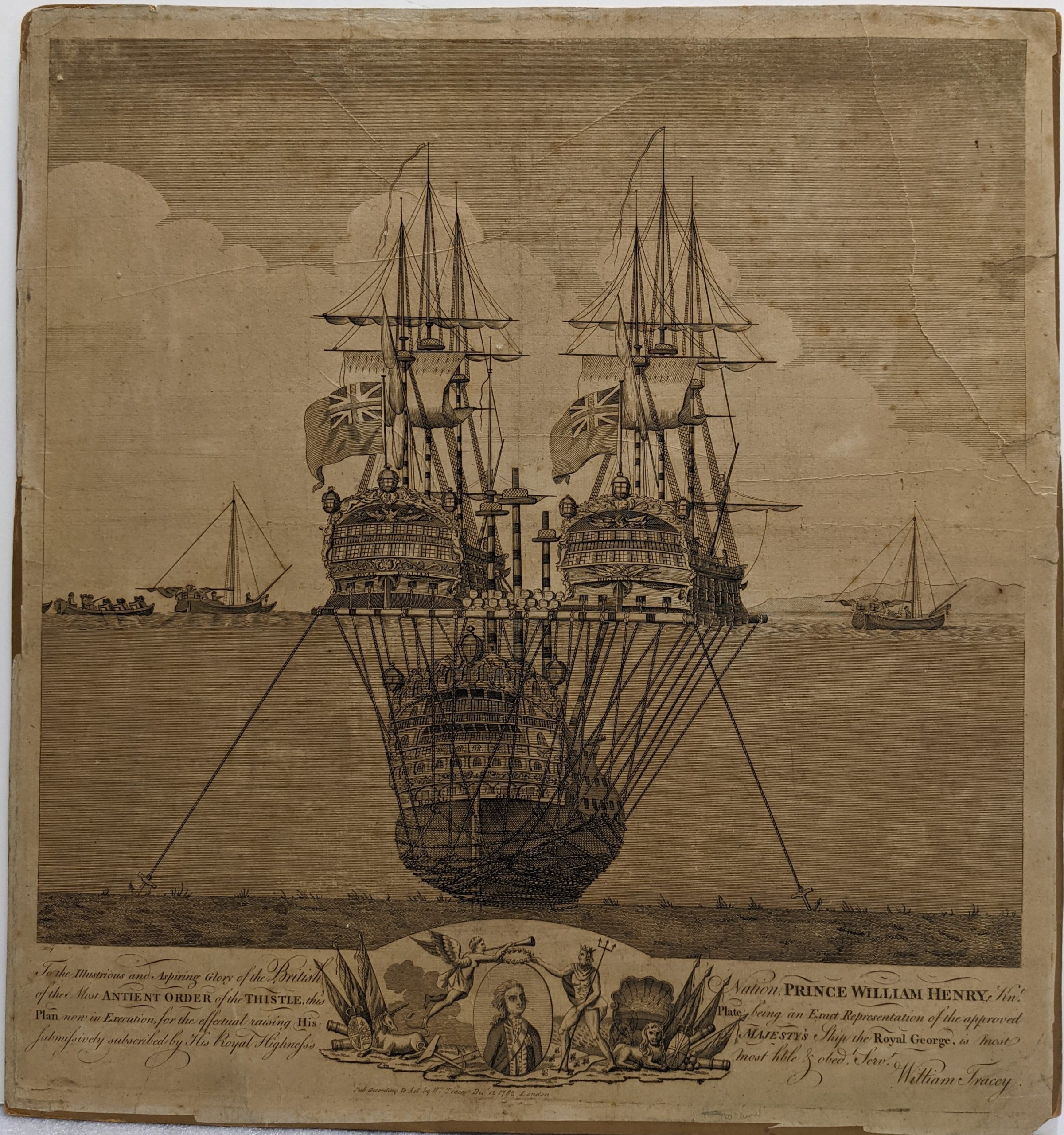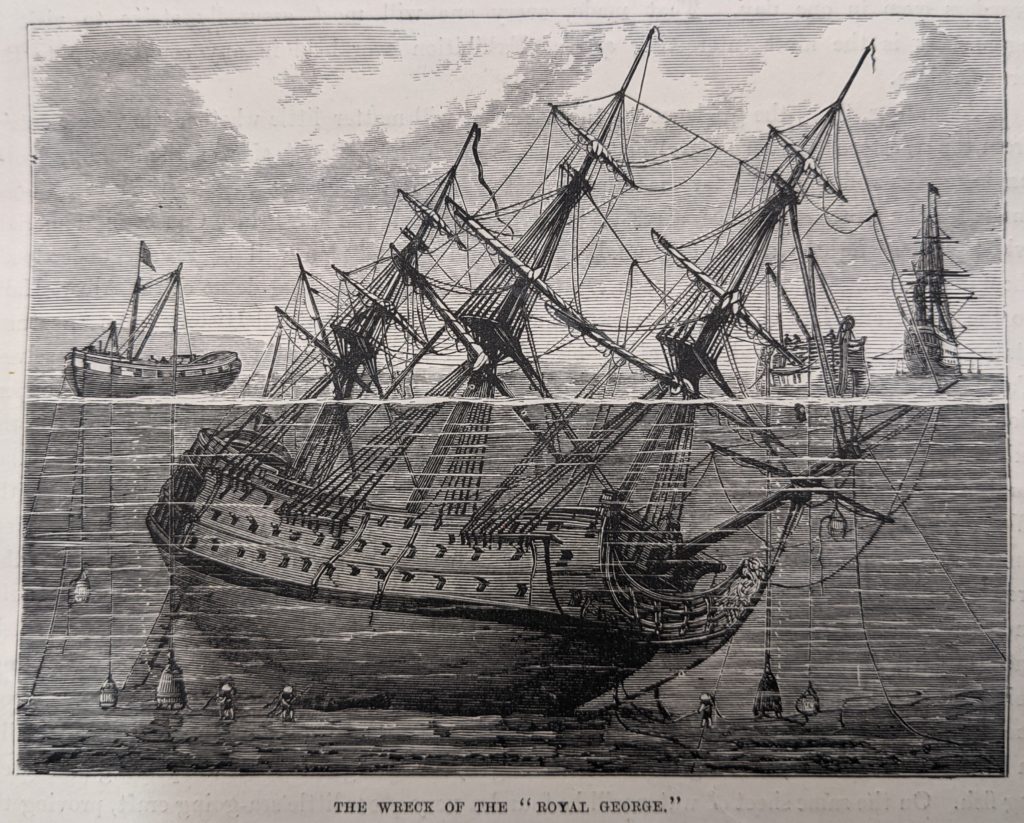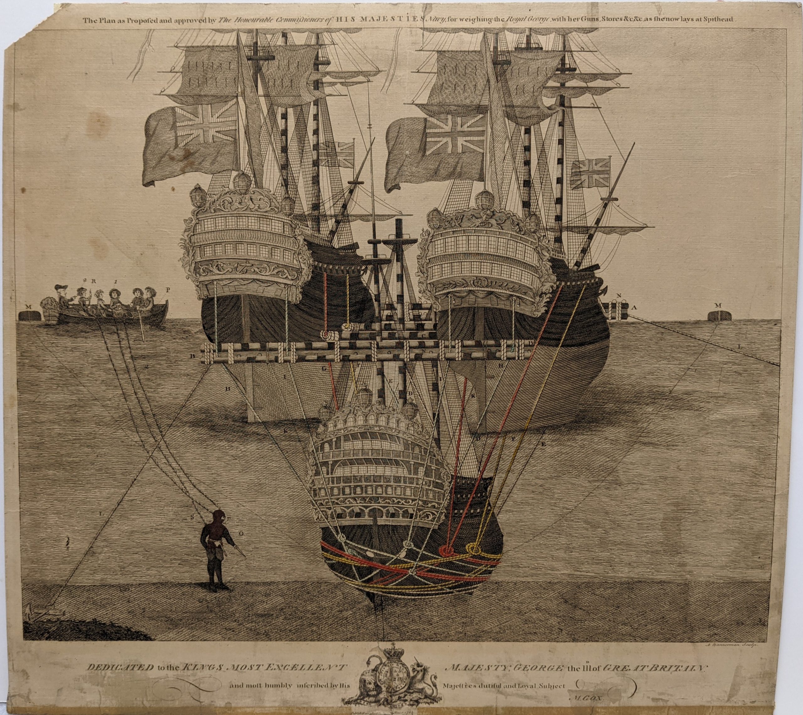 到了10月,海军部收到了回收船只或打捞枪支的建议。他们选择的计划是第二个由船舶经纪人威廉·特雷西提交的计划,他提议用链条和缆绳的吊索包裹船体,并将其连接到绑在两个打火机之间的木筏上。这种想法是,如果连接是在低潮时进行的,那么潮汐也会上升皇家乔治. 然后是木筏、打火机和皇家乔治可以被拖到较浅的水域。然后可以重复这个过程,直到船被抽出并重新漂浮。它确实起了一定的作用——特雷西设法把船身移动了三十多英尺——但他的努力总是受到天气和极其不合作的船坞管理人员的阻碍。6.