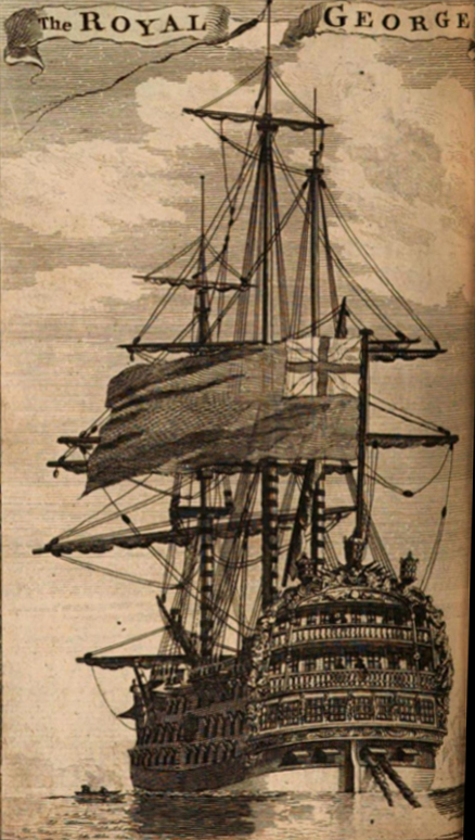 HMS皇家乔治建于1747年至1756年间,位于伍尔维奇造船厂。她是一艘新设计的战舰,发射时是世界上最大的战舰。虽然在七年战争和美国独立战争之间,她“平平常常”(意思是“卧床不起等待行动”)度过了许多年,但皇家乔治经常担任海军上将的旗舰。