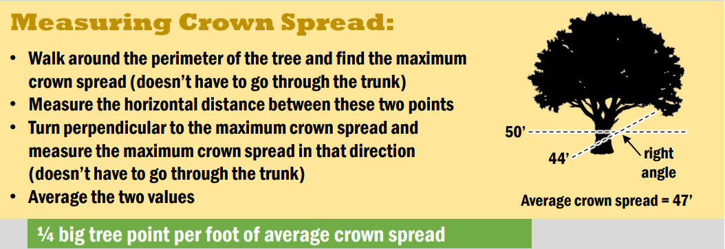 3.最后是测量树冠的宽度。树冠是树上所有地面上的东西;这包括从树干延伸出来的树枝和叶子。宽度是王冠的宽度。下面的图片说明了如何找到皇冠分布。在这一类别中,树木的平均树冠间距每英尺增加¼点。