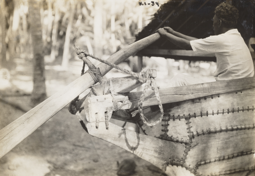 市长收藏的第一批照片是在信天翁10月31日在帕阿莫图(原波莫图)群岛的Nukutavake。在岛上工作期间,市长和渔业专家阿尔文·b·亚历山大检查了三艘长13½到17英尺的独木舟。独木舟是用椰子纤维绳缝在一起的木板做成的。在马约尔的画中,船尾的楔形物是用来固定船帆,并在操纵独木舟穿过海浪时支撑舵桨。亚历山大觉得努库塔瓦克的独木舟在构造上比他们检查过的任何其他独木舟都要好(我不敢苟同,他们检查过的其他一些独木舟真的很棒!)