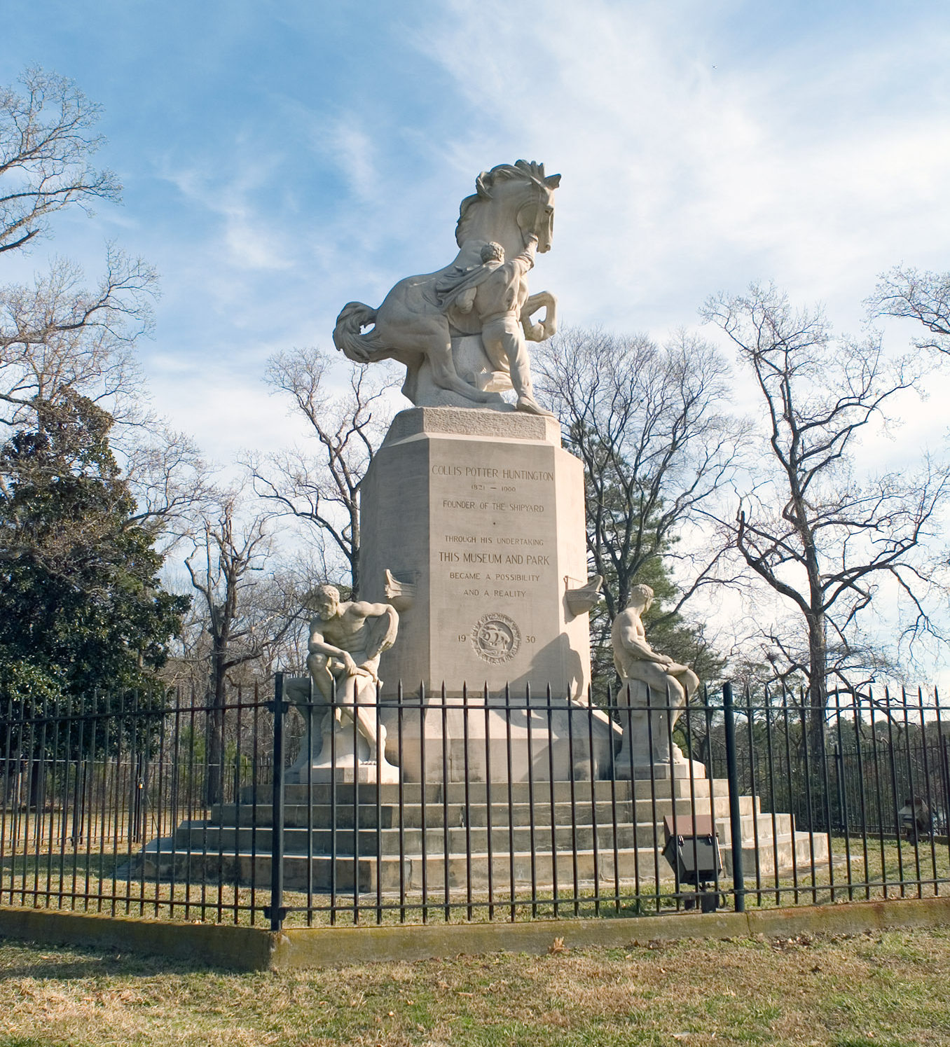 安娜设计这座雕像是为了纪念她的岳父、铁路大亨、新港新闻造船公司的创始人科利斯·p·亨廷顿。这部不朽的作品的中心人物是一个试图驾驭一匹被饲养的马的年轻人,这是科利斯·p·亨廷顿为利用身边的资源所付出的毕生努力的证明,也是他作为实业家取得成功的证明。在这张桌子的中央,两侧是艺术、工业、科学和学习的寓言雕像,亨廷顿熟练地使用这些工具来完成他的目标。