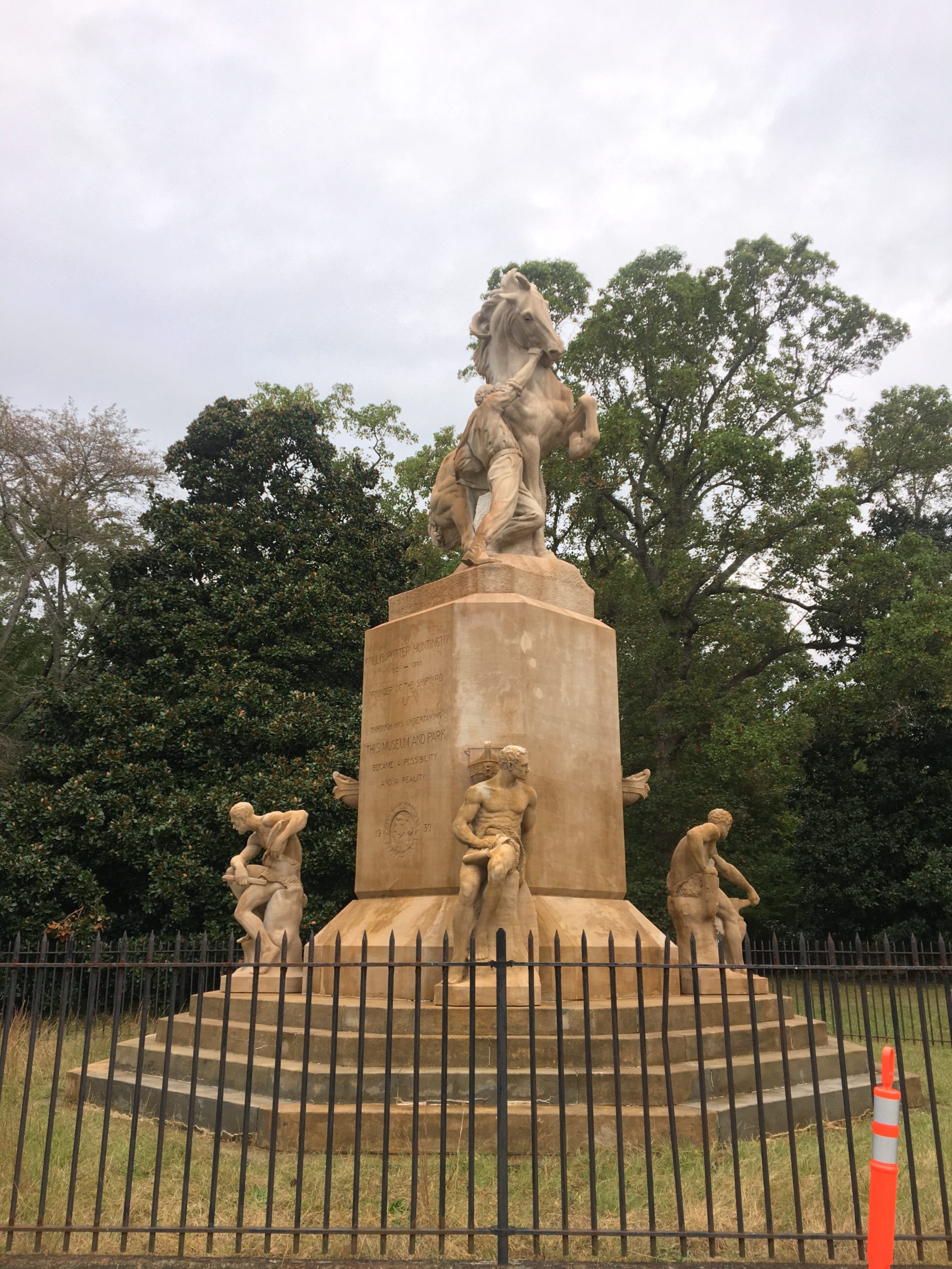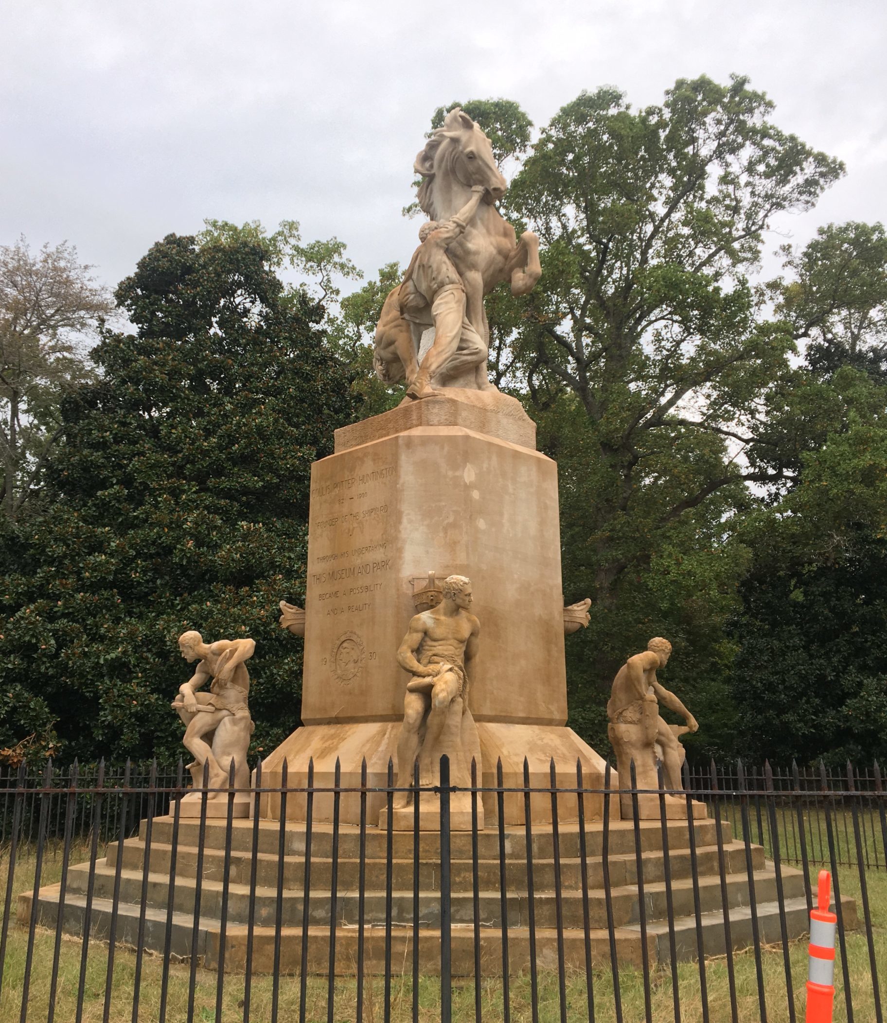 《征服荒野》的安装是工业和创新本身的证明。这座雕像在新泽西州雕刻,包括56吨重的基座,不得不通过铁路运到纽波特纽斯,再次让人想起科利斯·p·亨廷顿(Collis P. Huntington)的遗产。临时铁路轨道单位被用来运输雕像的部件,在铁路和现在称为纪念碑山的位置之间超过一英里。