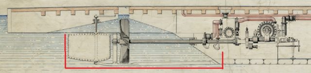 skeg延伸了船的后端,以稳定并保护螺旋桨和方向舵。监视器的skeg由一端连接到船尾板上的28英尺长的锻铁梁组成。在另一端,有一个孔可以使舵柱锁定在光束中并自由摆动。Y形支架坐在螺旋桨和方向舵之间。它螺栓固定在上层甲板的底面。螺旋桨轴的后端安装在Y支架上,使其自由旋转。