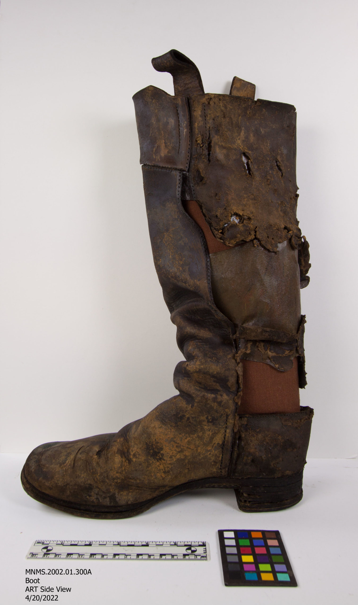 This treatment is a “re-treatment.” Occasionally, we’ll have an object that needs to be re-treated for various reasons. In this case, the Wellington boot was on display in ourMonitorCenter gallery. It is one of two boots from USSMonitorexcavated from the turret and is the most complete of the pair. This boot was displayed in Lieutenant Samuel Dana Greene’s cabin in the replica of USSMonitor’s crew quarters. As the boot is made predominantly of leather, fluctuations in humidity can cause the leather to expand or contract. These fluctuations caused the boot to slump over on its support. During a routine check of the galleries, Lesley Haines, a fellow archaeological conservator, found the boot leaning against its vitrine case. The decision was made to pull it off display for re-treatment. Not long after, I joined the team and took on the project as my first treatment project.