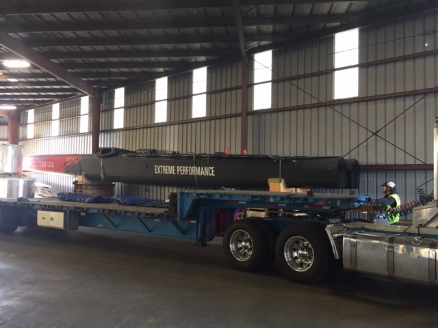 2014年,我们与Oracle Racing 2013年的岸上团队成员之一Chris Sitzenstock合作,将匕首板和其他捐赠物品运至博物馆。虽然克里斯不再为甲骨文工作,但他能够提供一些急需的建议,关于运输,组装和升降机OTUSA 17.虽然我有一些移动大型船只的经验,但这种运输显然需要一个全新的规划和组织水平。按照克里斯的建议,我们聘请了奥克兰的R & A货运公司来组织运输,这将需要广泛的许可,以获得超大的船体横跨全国(仅船体就有72英尺,包括卡车,总运输长度可能接近85到90英尺!)这个项目由Eric Weakley和Ben Soleimanieh负责,他们是R & A的运营经理。