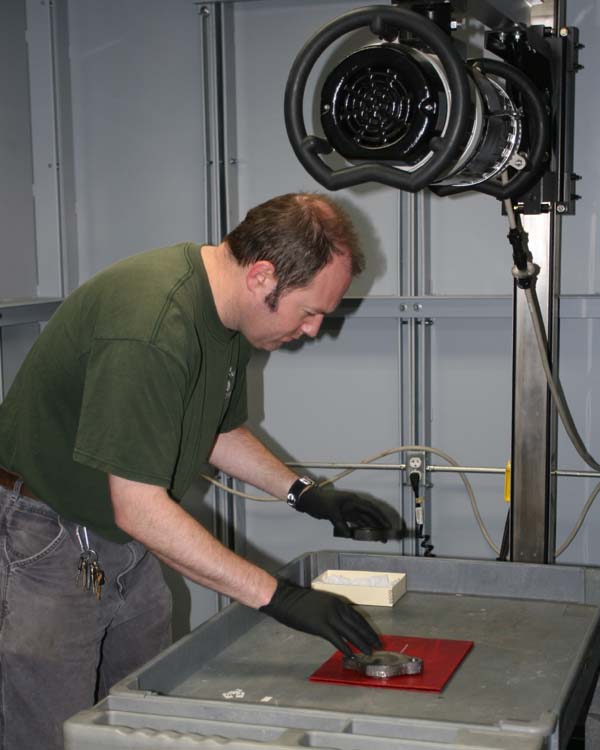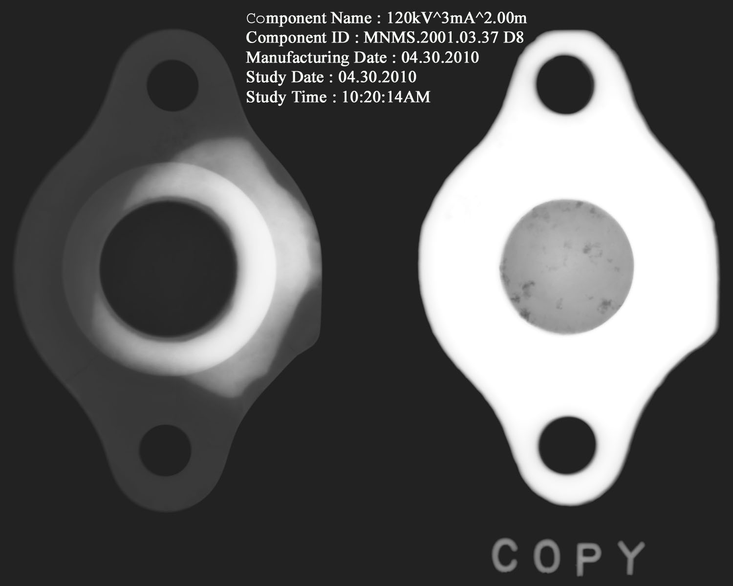 To help illustrate the difference between non-corroded cast iron and graphitized cast iron, last week we x-rayed the damping piston valve cover next to one of its copies cast at the Buffalo State College Foundry.