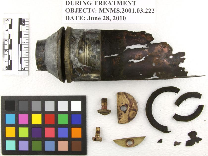 Posted onThis object was recovered in 2001 from theMonitor’s wreck site. Since its recovery, there has been much speculation as to the function of the artifact. It has been suggested that this object served as some kind of valve, possibly within a radiator-like system. It is also thought that it may be a component of a monitoring instrument, or even a whistle.