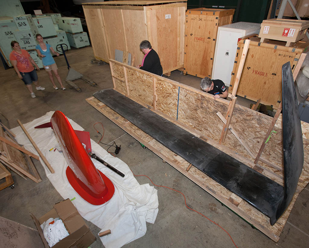 Those who have been reading this blog for awhile now may remember that about two years ago we received a very exciting donation of materials from Oracle Team USA, the winners of the America’s Cup Regatta. This donation included the J-foil daggerboard, T-foil rudder, bow replacement piece, and various crew gear. I’m happy to say that several of these pieces are now on display in our International Small Craft Center!