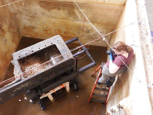 在行动的间歇,包括威尔去美国保护研究所(AIC)的年会上做了一个关于沃辛顿泵浇铸项目的精彩报告,我们回到冷凝器中度过了最后一周的兴奋。将完成注射泵支架的安装,并在进行了一些小的清除结核工作后进行安装。我们闪亮的新阳极装置没有任何问题就到位了。我们花了半天的时间在梯子上爬上爬下,放置新的参考电极,并确保所有的线路都是正常的。油箱也被彻底擦洗过。