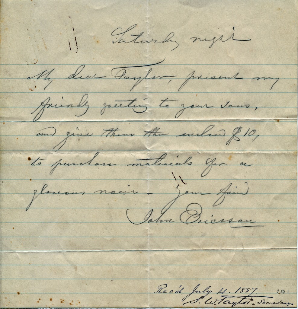 "My dear Taylor, present my friendly greeting to your sons, and give them the enclosed $10, to purchase materials for a glorious noise. Your friend, John Ericsson." Recieved July 4th, 1887. From The Mariners' Museum Collection.