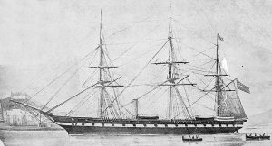 The USSRoanokewas aMerrimack-class steam screw frigate built at the Gosport Navy Yard. The frigate was commissioned in 1857 and became the flagship of the Home Squadron. When the Civil War erupted,Roanokecaptured several blockade runners and fought during the March 1862 Battle of Hampton Roads. Noting how the Confederates had transformedMerrimackinto the ironclad CSSVirginia,the woodenRoanokewas converted into an ironclad at the Brooklyn Navy Yard. The newRoanokefeatured three turrets; however, the extra weight of the iron made the vessel unstable and it spent the rest of the war in Hampton Roads, Virginia, and was scrapped in 1883.