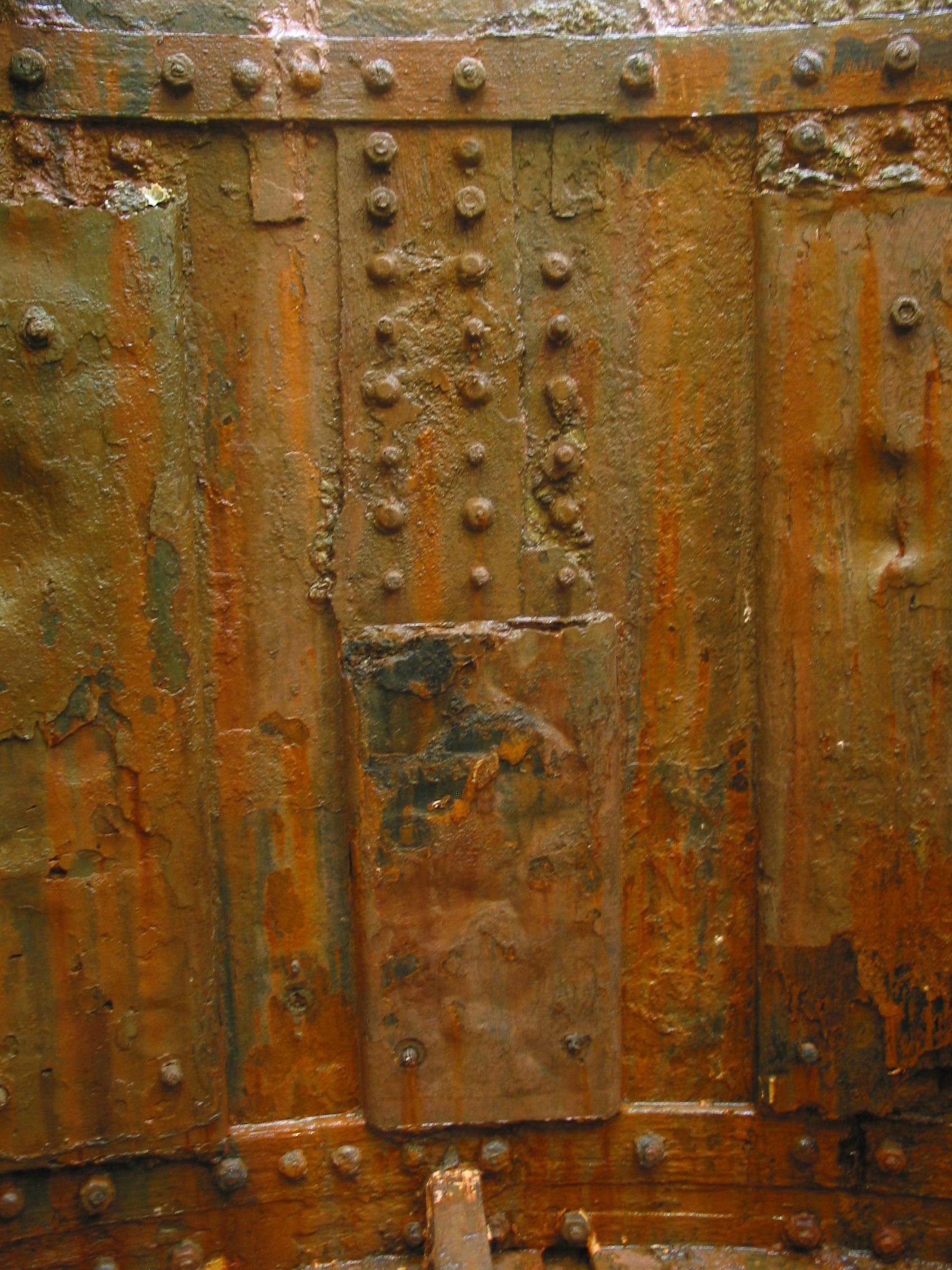 贴在在监控在它的炮塔上有一系列薄薄的锻铁板,覆盖着一排排将炮塔装甲连接在一起的螺母和螺栓。这些钢板的目的是防止螺母从螺栓脱落,并在战斗中遭受重创时在炮塔内飞来飞去。被称为螺母保护的盘子大约是1/8th一英寸厚的轧制铁板,几英尺宽,几英尺长,边缘弯曲,像一个深的饼干片。每个螺母保护装置由靠近板的上下边缘的一对螺栓固定。螺母挡板后面的空间充满了泥泞的沉积物,而监控就在海底。