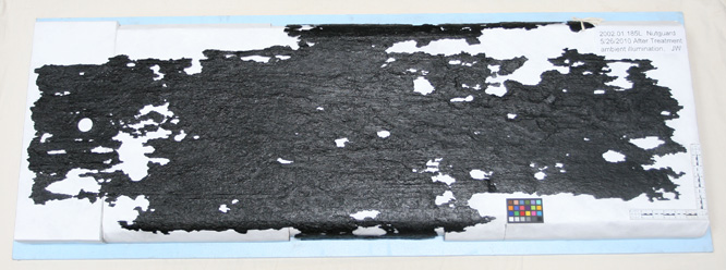 最近从炮塔上拆下了一个螺母护罩,以便能够小心地清除沉淀物。然后,钢板被隔离在一个小的处理槽中,在那里进行脱盐。螺母防护板在海洋中不太好用,因为它是由相对较薄的锻铁板制成的。薄板上的许多洞都生锈了,弯曲的边缘非常脆弱。在pH为12的氢氧化钠(NaOH)溶液中浸泡,并进行温和的电解还原。提取到溶液中的氯化物水平已经稳定了几个星期。周二我们最后一次改变了解决方案。在这个过程中,我们还冲洗掉了相当多的软表面锈和腐蚀薄片。在海底呆了140年之后,表面看起来出奇的好。现在,文物保护人员在冲洗文物以去除残留的氢氧化钠之前,将文物浸泡大约两周以上。 The artifact will then be removed from its rinse and then dried. The next challenge is to create a supportive mount to store and display this heavy but very fragile artifact.