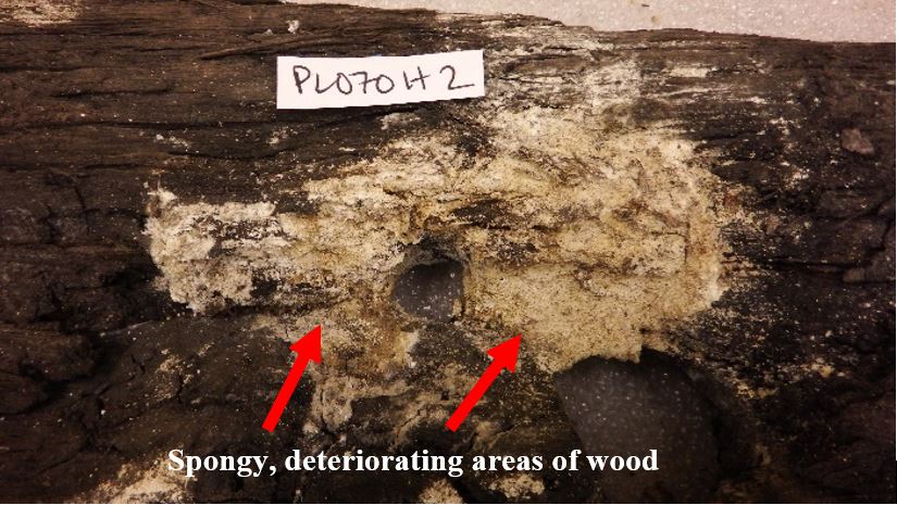 图3。卡罗莱纳公主的一根木头的一个固定孔周围的一块退化的木头。图片由水手博物馆和公园提供。亚博平台网址