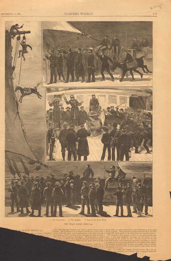 While spending some time going through a stack of Harper’s Weekly articles we have, I found some really interesting subjects. The one that stuck out the most was titledThe Dead Horse Festival. First mistake was looking at the imagery before reading the article. I thought they were throwing a real horse from the ship; they aren’t.