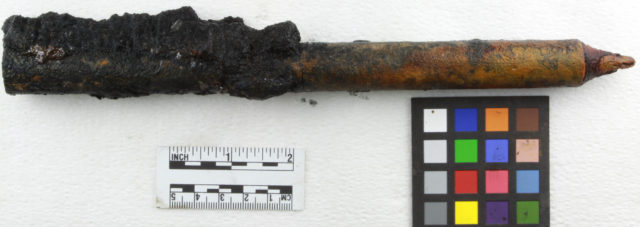 This brush was originally found stuck to one of the gun carriages, covered in mud and concretion – the hard, rocky material that forms around corroding iron. Although the brush itself is entirely organic – wood and fiber – it was so close to the iron of the gun carriage that it was caught inside concretion formed by that object. As a result, it didn’t look like much to begin with.