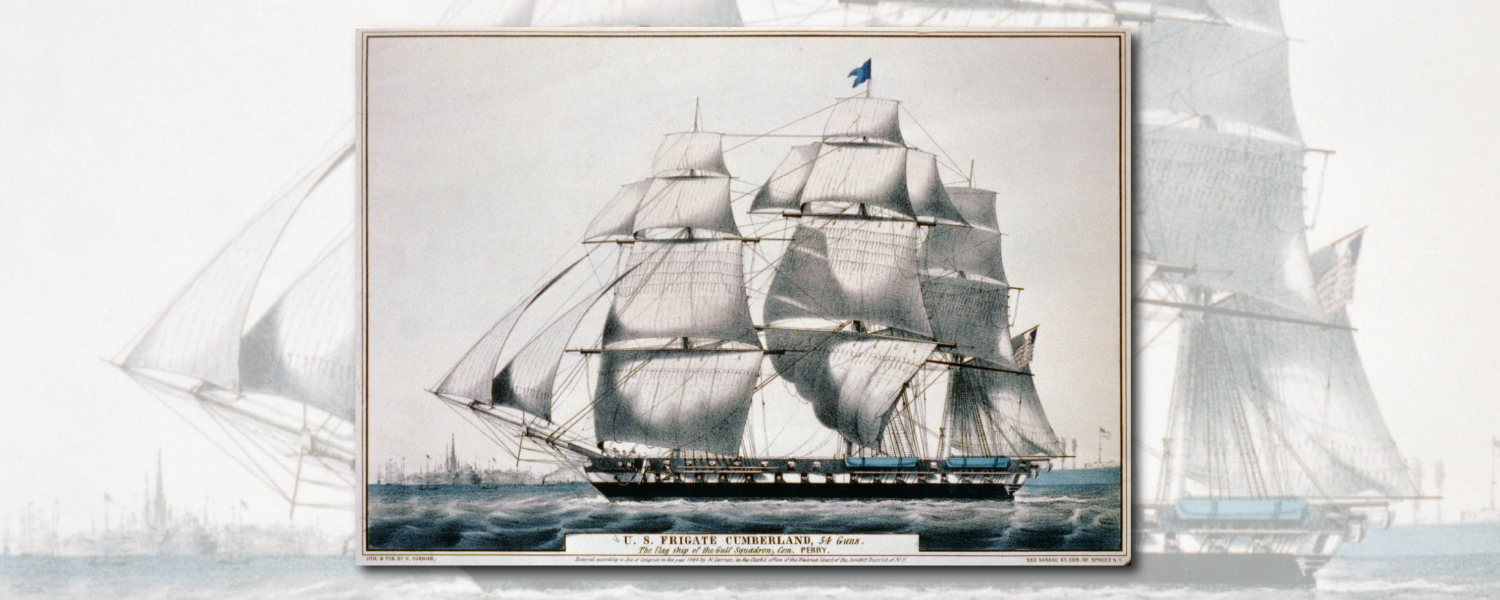 该USS坎伯兰是力登级50枪帆船护卫舰。在1816年最初订购,军舰并没有推出,直到1842年在墨西哥战争期间在地中海中队担任了三个巡航和作战的船只。护卫舰被夷为在查尔斯顿海军造船厂,1855年至1857年战争的单桅帆船。被改造的军舰被分配到非洲站从巡逻。在1860年,坎伯兰是家庭中队的旗舰。这坎伯兰逃过毁灭,当联邦官员在1861年四月被遗弃的戈斯波特海军船厂十一个月后,坎伯兰赚的是通过铁定沉没第一木质军舰半信半疑的分别在1862年3月8日,当CSS弗吉尼亚州摧毁了证明铁比木头威力更大的过时单桅帆船。