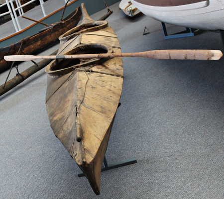 通常皮艇只能载一个人。像这样的双人皮划艇可能是在俄罗斯人招募当地阿拉斯加人来捕猎海獭和运载乘客的时期开发出来的。