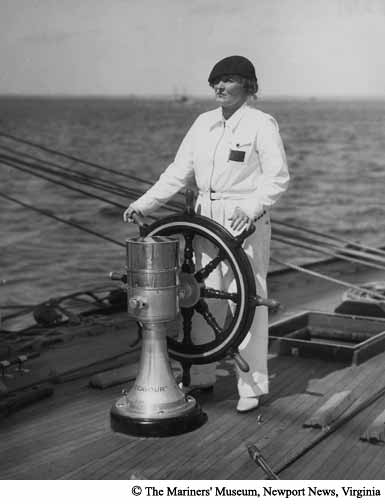 Lady Sopwith at the Helm of theEndeavour埃德温·莱维克,摄影师The Mariners' Museum Research Library and Archives, Edwin Levick Collection