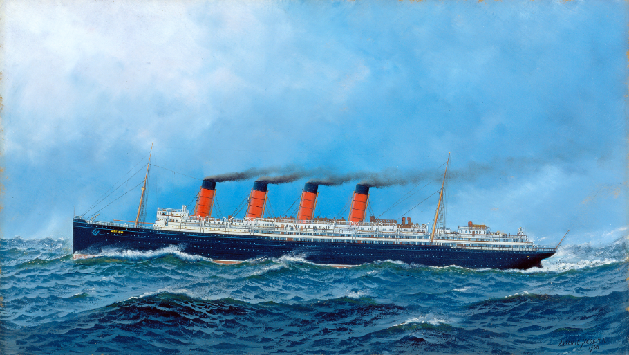 1906年6月7日,英国丘纳德航运公司推出了世界上最大的轮船——RMS卢西塔尼亚号。它由伦纳德·佩斯基特设计,由苏格兰克莱德班克的约翰·布朗公司建造,始于1904年。经过两年的建造,这艘令人印象深刻的船长约787英尺,重超过31500吨。这是一艘豪华的船,但它的速度更引人注目。在爱尔兰海岸进行了一年的海上试验后,卢西塔尼亚号1907年9月7日,从英国利物浦启航,向纽约进发。一个月后,这艘客轮以24节的速度赢得了最快横渡大西洋的蓝丝带奖。在接下来的八年里,卢西塔尼亚号与它同样出色的姊妹舰RMS一起毛里塔尼亚它将不停地以时尚的方式运送乘客穿越大西洋。然而在1915年5月,卢西塔尼亚号许多乘客和机组人员都成了一战的牺牲品。