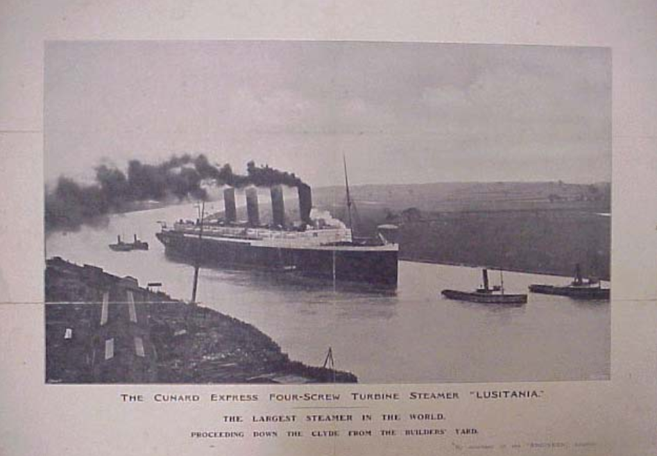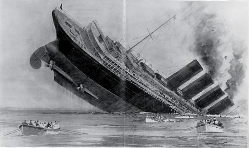 英国政府警告说卢西塔尼亚号避开某些区域,并以之字形航行,以迷惑和躲避德国潜艇。尽管有警告和危险,威廉·特纳船长还是照常踏上了旅程。机上大约有1959人:702名机组人员和1257名乘客。其中159名乘客是美国人。1915年5月7日下午2点多,在爱尔兰海岸附近,一艘德国潜艇发射了两枚鱼雷,击中了潜艇的右舷卢西塔尼亚号.在被击中后,第二次更大的爆炸严重损坏了这艘船,导致它在20分钟内沉没。